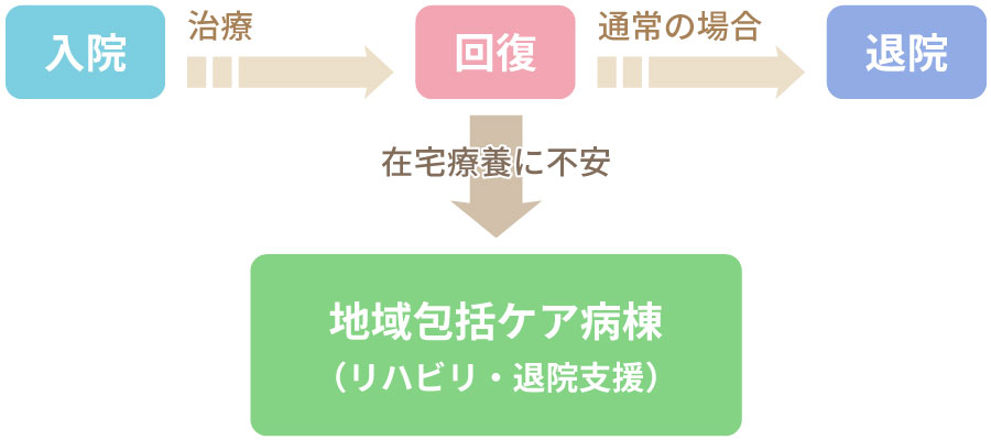 急性期治療を経過し、病状が安定した患者さまに対して、ご自宅や介護施設への早期復帰を目的として治療や準備・支援を行う病棟で、すぐに在宅や施設へ退院するには不安がある方を対象としています。在宅復帰の準備を整え、安心して地域へお戻りいただけるよう、お手伝いすることを目的としています。