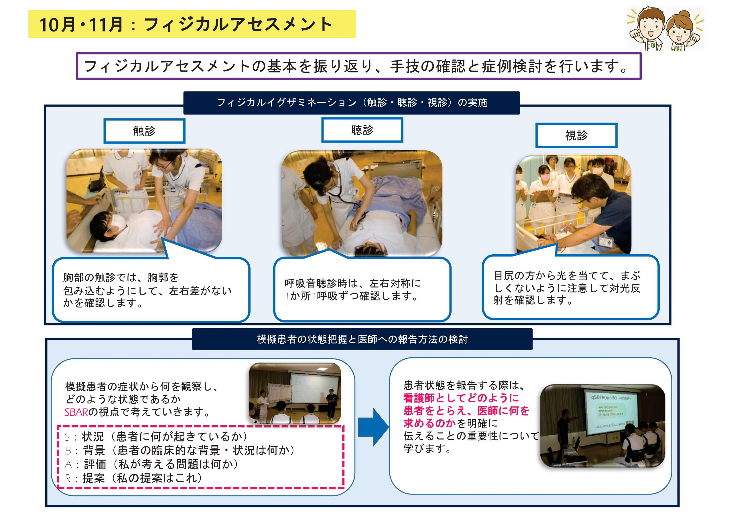 新人看護師は問診から視診・触診の方法や臨床推論について学び、今後起こり得ることを予測して対応していくことの重要性を学ぶことができました。