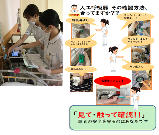 沖縄病院には肺がん・神経筋難病センターがあり、常時約50台の人工呼吸器が稼動し、全看護スタッフが患者様に安全で安心できる人工呼吸器管理を行なっています。副看護師長会では、更なる看護の質の向上と確認行動の習得を目的に、人工呼吸器確認方法の動画を作成しました。また動画を視聴した後の確認テストの実施、各病棟において自己、他者による確認行動のチェックを実施しています。お互いに声を掛け合いながらチームワークで医療安全文化の醸成につなげています。