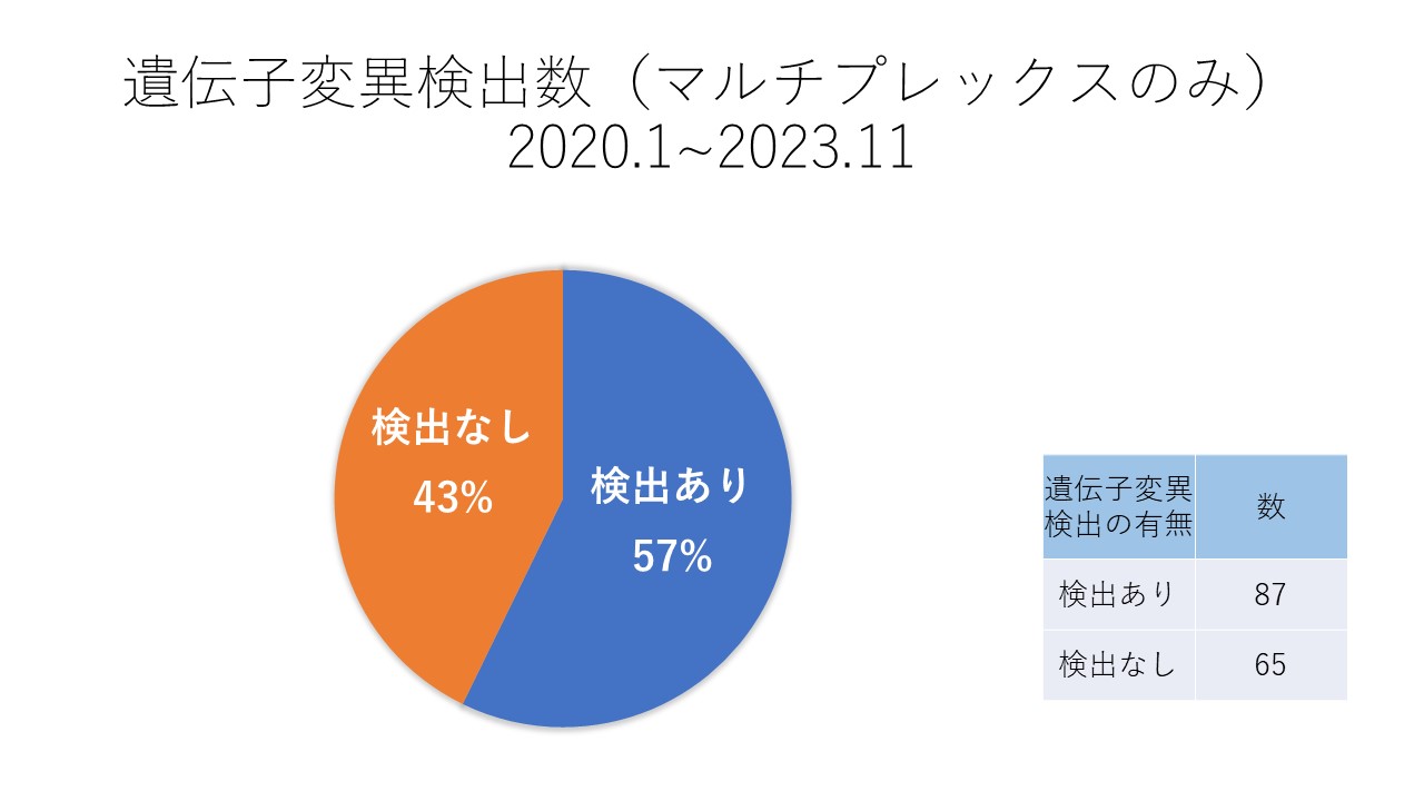 ②マルチプレックス遺伝子検査では57%で遺伝子変異が検出されました。
