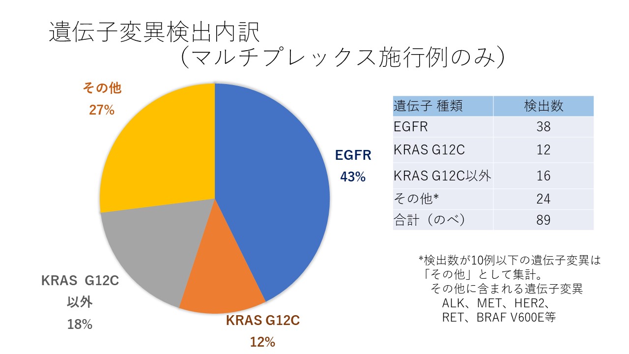 ③遺伝子変異検出ではEGFR変異が最も多く(43%)と次いでKRAS変異(30%)を多く認めました。